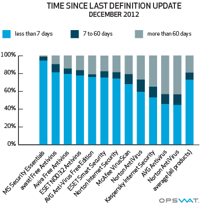 Неутешительная картина наблюдается среди пользователей AVG AntiVirus, примерно 40% которых полагаются на сигнатуры, устаревшие более чем на два месяца. В целом, лишь около 70% владельцев антивирусов могут похвастаться базами как минимум недельной давности.