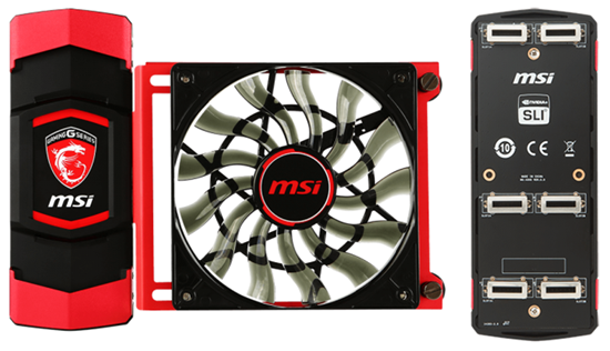 Мостики MSI, рассчитанные на трёх- и четырёхпроцессорные системы multi-GPU, оснащены фирменным 120-миллиметровым вентилятором, нагнетающим воздух в промежутки между картами и хоть немного, но способствующий снижению их температур. К сожалению, применён вентилятор толщиной 15 миллиметров, хотя в данной ситуации было бы уместно нечто вроде Corsair SP120 или любого другого вентилятора, оптимизированного на достижение высокого статического давления. Система в сборе имеет габариты 160 × 214 × 37 миллиметров и весит 236 граммов. Модели мостиков для 3-way и 4-way SLI отличаются только количеством разъёмов: 6 и 8 соответственно.