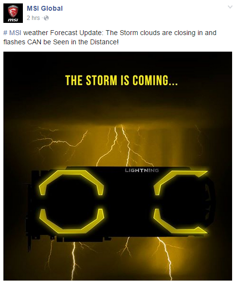 Ранее, когда был анонсирован графический процессор NVIDIA GM204, компания MSI заявила, что не планирует выпускать версию графической карты Lightning на его основе. Шло время, появился GM200 и решения на его основе — TITAN X и GeForce GTX 980 Ti, но MSI лишь однажды напомнила о своём намерении продолжить линейку Lightning. Теперь, спустя два месяца, компания вновь дразнит своих поклонников рекламными изображениями будущей новинки.