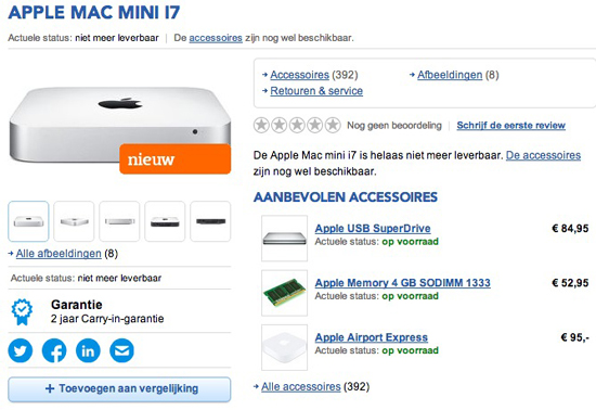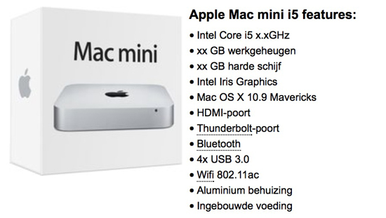 Один из ритейлеров Apple в Бельгии невольно (а, может быть, намеренно) пролил свет на эту тайну. На его сайте Computerstore.be неожиданно появились Mac mini с чипами Intel Haswell в вариациях Core i5 и Core i7. Представители магазина сообщили порталу MacRumors, что информация поступила «от Apple или доверенных источников», а появление компьютера в продаже они ожидают уже к концу февраля.