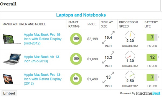 Бен Тейлор пишет: «Может быть вы технический фанат и хотите лучшую машину, которую возможно купить, независимо от того влезет ли она в ваш портфель или будет стоить два месяца арендной платы. Итак, какие ноутбуки получили самые высокие оценки? С низким весом, высокой производительностью, четким дисплеем и безграничной похвалой экспертов, два ноутбука Apple с ретина-дисплеем MacBook Pro и последняя модель MacBook Air стали золотым, серебряным и бронзовым призерами в нашем рейтинге 1000+ ноутбуков».