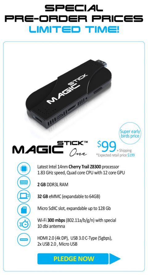 Также предлагается модель MagicStick One на Cherry Trail Z8300 1,83 ГГц с 2 Гб памяти и 32 Гб of eMMC. Она стоит в США $99 + поставка, розничная стоимость составит $199. Оба устройства обладают поддержкой HDMI 2.0 для вывода изображений 4К и USB типа С, а помимо пробной версии Windows 10 Home со сроком годности 3 месяца установлена Android Lollipop. Мобильное приложение позволяет дистанционно контролировать устройство при подключении к телевизору.