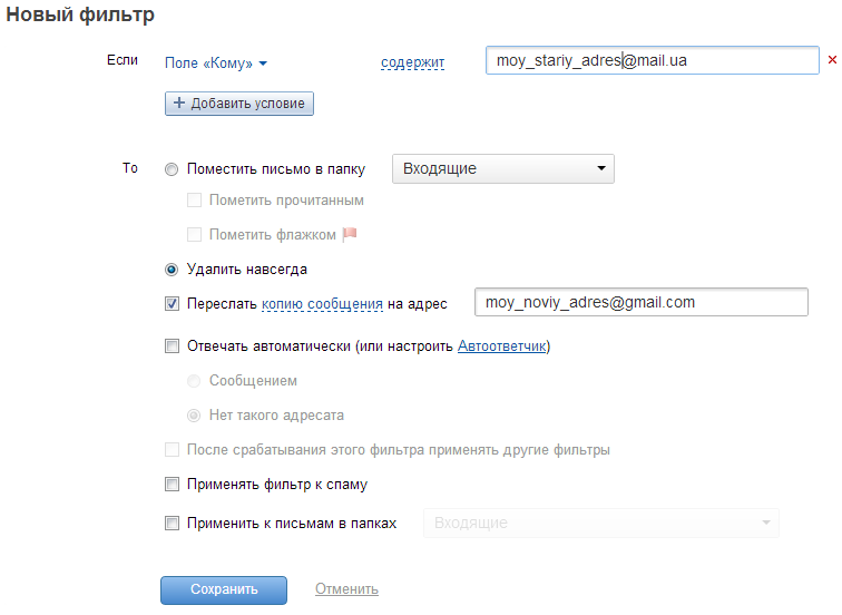 Для того, чтобы письма, адресованные вам, пересылались на новую почту, нужно сделать следующее - зайти в настройки почты, выбрать вкладку «Фильтры и пересылка» и создать фильтр в точности, как указано на скриншоте ниже.
