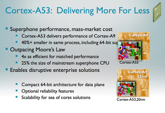 Сообщается, что до конца года компания представит как минимум два чипа на базе ARM Cortex-A53 (архитектура ARMv8). Напомним, что ядра Cortex-A53 обеспечивают производительность на уровне Cortex-A9, имея при этом поддержку 64-битных инструкций и полную совместимость с ARMv7. Среди особенностей Cortex-A53 можно назвать мультимедийный SIMD-движок NEON, математический сопроцессор, от 128 Кбайт до 2 Мбайт кеш-памяти L2 и поддержку исполнения команд с изменением последовательности.