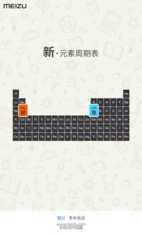 Смартфон Meizu Blue Charm Metal должен быть официально представлен уже 21 октября. Сегодня на Weibo был обнаружен тизер устройства, демонстрирующий периодическую таблицу химических элементов, в которой особое внимание уделяется магнию (Mg) и алюминию (Al). Очевидно, что тизер намекает на использование магниево-алюминиевого сплава при изготовлении корпуса смартфона. Также появилась информация, что Meizu Blue Charm Metal будет доступен в пяти цветах: розовом, голубом, цвете "шампань", графитовом и белом.