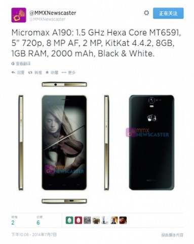 В своем Twitter-аккаунте компания Micromax объявила о скором появлении смартфона Micromax A190. Аппарат будет оснащен вышеупомянутым шестиядерным процессором, 5-дюймовым 720p-дисплеем, 1 ГБ оперативной и 8 ГБ внутренней памяти с возможностью расширения с помощью карт microSD, 8-мегапиксельной основной и 2-мегапиксельной фронтальной камерами, а также аккумулятором ёмкостью 2 000 мАч. Устройство будет работать под управлением Android 4.4.2 KitKat.