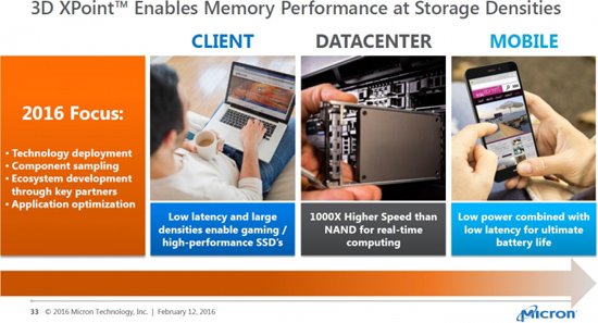 «Большой интерес к 3D XPoint проявляют в мобильной индустрии», — сказал Брайан Ширли (Brian Shirley), вице-президент Micron по технологиям памяти и решениям на их базе, в ходе встречи с финансовыми аналитиками. «[Решения для центров обработки данных и клиентских ПК] относительно просты в создании и внедрении. Разработка мобильных решений займёт больше времени, поскольку нам надо будет удостовериться, что вся экосистема работоспособна. Подумайте об энергопотреблении и что оно значит для времени автономной работы, а также о производительности».