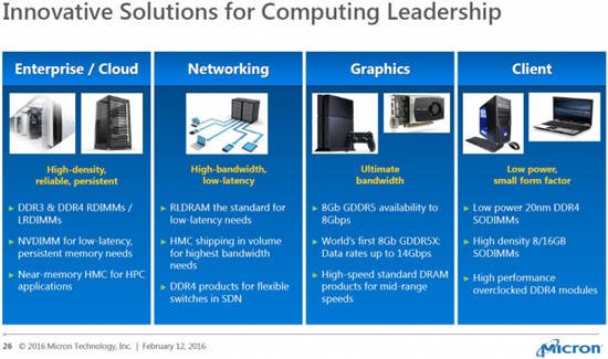 В течение долгих лет компания Micron отдаёт особое внимание выпуску специализированных типов памяти, а также решений на их базе, цена которых не подвержена колебаниям, как цены на традиционные DDR и NAND. Так, компания производит RLDRAM для устройств, которым требуются минимальные задержки (по сравнению со стандартной DRAM) при большой ёмкости (относительно SRAM); XTRMFlash для приложений, которым нужна NOR флеш-память и высочайшая производительность (скорость чтения у данного типа NOR составляет 400 Мбайт/с); HMC (hybrid memory cube) для систем, которым требуется максимальная пропускная способность (наиболее производительные микросхемы Micron HMC второго поколения поддерживают пропускную способность в 160 Гбайт/с). Позже в этом году Micron начнёт поставки памяти GDDR5X для будущих графических карт и 3D XPoint для производительных твердотельных накопителей. Кроме того, Micron предлагает решения на базе DRAM с высокой добавленной стоимостью, например, энергонезависимые модули NVDIMM на базе микросхем DDR3 и супер-конденсатора AgigA Tech PowerGEM, которые сочетают производительность DRAM и энергонезависимость NAND.