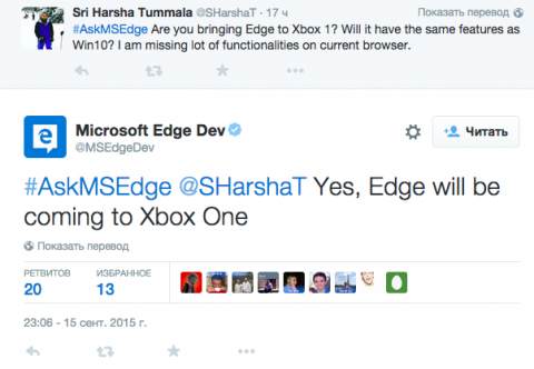 Пользователи Twitter также поспешили задать разработчикам Microsoft Edge вопросы касательно функций браузера в исполнении для Xbox One, но на момент написания данной новости ответов пока не поступило.