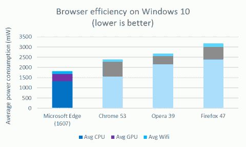 Ноутбук, использовавший Edge, продержался на 69% дольше, чем Firefox, на 45% дольше, чем Chrome, и на 23% дольше, чем Opera. В том, что касается использования браузера не для просмотра видео, а в целом, после обновления эффективность Edge увеличилась на 10%.