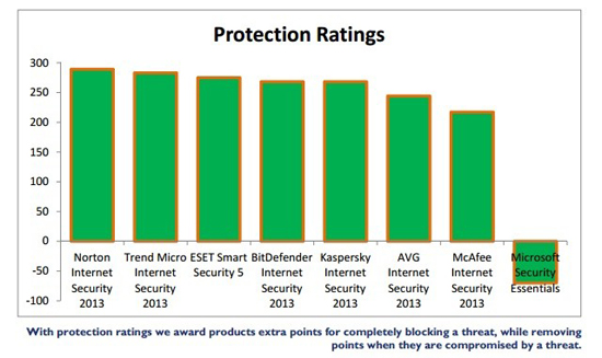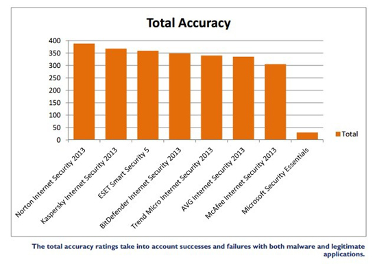 Показатель точности MSE оказался на уровне 30 из максимальных 400, в то время как Norton Internet Security, версия 2013 года, получил 388.5 очков. Кроме того, тестируемым программам присваивался рейтинг от ААА до С. MSE не занял ни одну позицию, при этом пять из оставшихся семи продуктов получили рейтинг, как минимум, А.