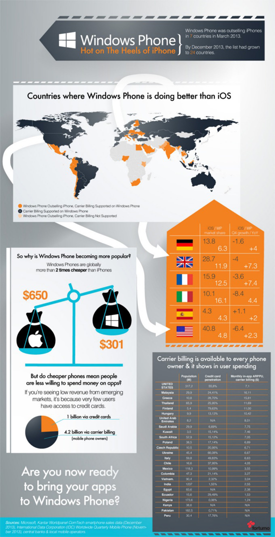 В прошлом декабре насчитывались 24 страны, где продажа устройств на Windows Phone превысила продажи Apple iPhone. Компания Kantar, занимающаяся исследованиями рынка, назвала Windows Phone самой быстрорастущей мобильной операционной системой в мире. В 2013 году в США продажи Windows Phone-устройств выросли на 67%, что увеличило долю Microsoft на рынке смартфонов США до 5%.