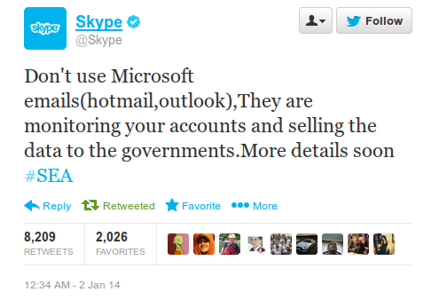 В начале января сирийцы получили доступ к твиттер-аккаунту и блогу Skype. Под аккаунтом Skype хакеры разместили запись, в которой призвали кого-то (вероятно, Microsoft) перестать шпионить за людьми, а под своим аккаунтом выложили в открытый доступ номер телефона Стива Балмера с предложением поблагодарить его за слежку.