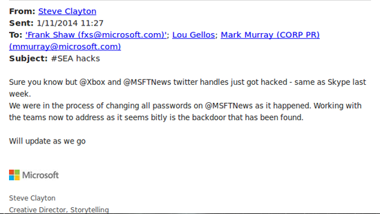 Спустя две недели сирийцы взломали сайт microsoft.com, блог Microsoft, твиттер-аккаунт Xbox и учетные записи нескольких сотрудников компании. Взлом почты, как призналась Microsoft, производился банально: злоумышленники разослали письма со ссылкой на троян, подождали, пока кто-нибудь перейдет по ней и завладели аккаунтами. Ничего интересного они там не нашли, но пообещали продолжить атаку.