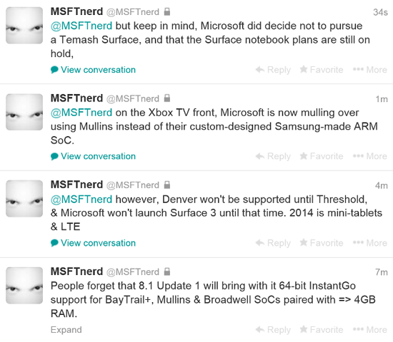 MSFTNerd (никнейм источника) также сообщает, что Microsoft работает над мини-версией Surface, которая будет соперничать с 7- и 8-дюймовыми планшетами на базе Android и iOS. С недавних пор Windows 8.1 поддерживает работу на планшетах небольшого размера, и такие планшеты сразу же начали появляться в заголовках новостей. 2014 год, по словам MSFTNerd, станет годом LTE и небольших планшетов. Велика вероятность того, что разрешение экрана Surface Mini составит 1080p, а управлять планшетом можно будет жестами руки.