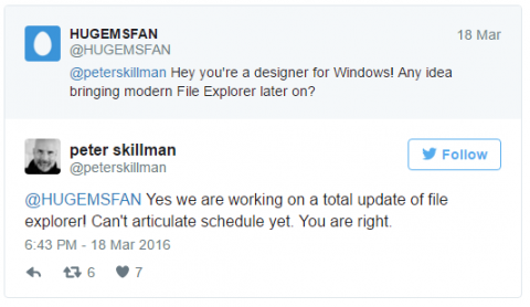Питер Скиллман, который является одним из дизайнеров настольного интерфейса Windows 10, ответил на вопрос пользователя в Twitter, заявив, что они сейчас работают над масштабным редизайном "Проводника", но вот про сроки выхода этого обновления он пока говорить не готов.