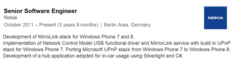 Стандарт MirrorLink был представлен несколько лет назад и представляет собой специальную технологию, с помощью которой вы можете подключить свой смартфон к автомобильной информационно-развлекательной системе и получить доступ к GPS и другим приложениям непосредственно с установленного в машине бортового компьютера. Microsoft уже несколько лет является членом консорциума Connected Car Consortium, однако до сих пор не заявила ни одного устройства с поддержкой MirrorLink. Однако, судя по постам в LinkedIn, работа в этом направлении всё же ведётся.