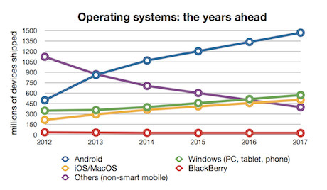 Уже в будущем году число устройств с установленной операционной системой Android должно будет достичь одного миллиарда, в то время как доля Blackberry станет ниже, чем у Windows Phone. Тем временем, продажи планшетов превзойдут продажи настольных компьютеров.