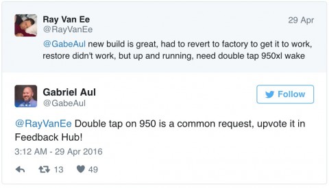 Судя по словам Габриэля Аула, пользователи Windows 10 часто обращаются с подобным вопросом и шансы получить функцию разблокировки по двойному тапу с обновлениями системы всё-таки есть, если она наберёт достаточное количество голосов в разделе отзывов о Windows 10 Mobile.