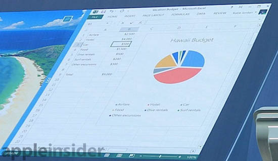 На биллборде изображена реклама Microsoft Surface, где демонстрируется возможность планшета, отсутствующая у его конкурентов: одновременный запуск двух приложений в режиме разделения экрана. На рекламном постере одновременно открыта фотография с Гавайев и приложение Excel из пакета Microsoft Office, в котором рассчитывается бюджет поездки.