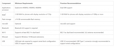 Microsoft обновила информацию о минимальных и рекомендуемых системных требованиях, необходимых для использования функции Continuum на мобильных устройствах. Среди основных нововведений стоит отметить поддержку процессоров Qualcomm Snapdragon 617. Если верить Microsoft, для запуска Continuum устройствами с дисплеями разрешением 1280х720 потребуется как минимум 2 ГБ оперативной памяти. Девайсам же с Full HD-экранами для поддержки Continuum понадобится 3 ГБ "оперативки". Подробнее с перечнем требований можно ознакомиться на изображении ниже.