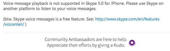 «Воспроизведение голосовых сообщений не поддерживается в Skype 5.0 для iPhone. Для прослушивания голосовой почты, пожалуйста, используйте Skype на других платформах».