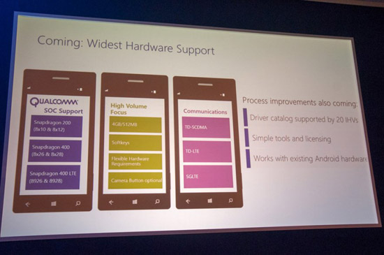 Microsoft продолжает расширять список поддерживаемого оборудования — теперь вендоры могут производить аппараты с недорогими чипами Snapdragon 200, 400 и 400 LTE. Возможность установки приложений на карту памяти позволит производителям выпускать сверхдешевые устройства с 4 ГБ памяти и 512 МБ оперативки.