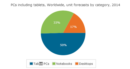 По прогнозам экспертов, в 2014 году поставки персональных компьютеров превысят 575,3 млн единиц, из которых планшеты займут примерно 50% объема. В третьем квартале нынешнего года доля планшетов измерялась 40%. В 2017 году этих аппаратов будет выпущено в количестве 396 млн штук против 285 млн единиц в 2014 году.