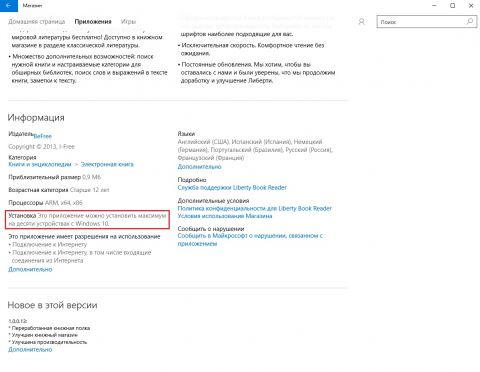 Увидеть новое ограничение можно в любом приложении магазина Windows Store в разделе «Информация». Для многих пользователей этого количества будет вполне достаточно, позволяя установить программы на компьютер (рабочий и домашний), ноутбук, смартфон, планшет и приставку Xbox One. Однако если использовать один аккаунт для всей семьи или компании, могут возникнуть затруднения.