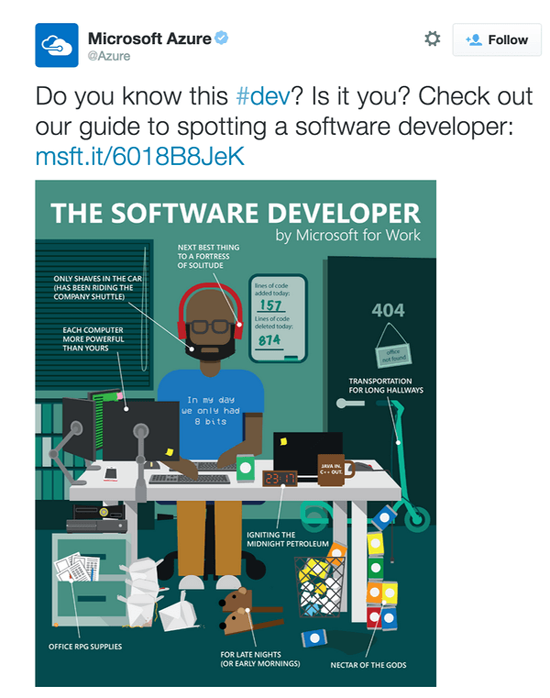 Инфографика «Как вычислить девелопера» 9 июля была опубликована в официальном микроблоге облачного сервиса Microsoft Azure. На картинке в качестве «типичного программиста» был показан сидящий за столом темнокожий мужчина с бородой.