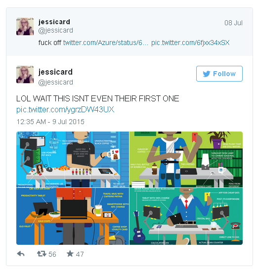 Одна из пользовательниц также обратила внимание на то, что инфографика является не первой в своём роде. Ранее Microsoft в рамках одной серии выпускала картинки о «типичном работнике IT», «типичном маркетологе», «финансовом директоре» и «мобильном разработчике».