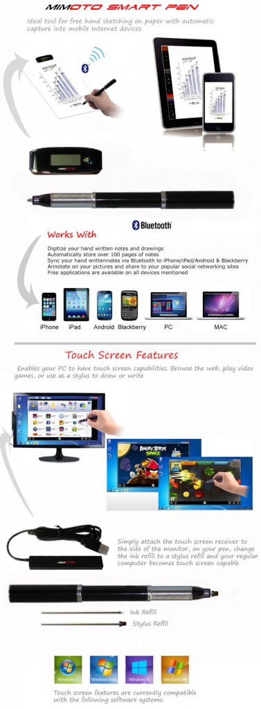 Бывают такие случаи, когда письменные заметки необходимо перенести в цифровой вид, и специальная ручка Mimoto SmartPen поможет вам в этом как нельзя лучше. Ручка разработана компанией Mimoto Tech. По заявлениям производителя, это первая в мире "умная" ручка, позволяющая создавать заметки на бумаге и выполняющая роль стилуса для сенсорных дисплеев.