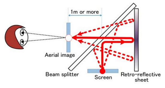 Для реализации проекта компания использует два типа оптических элементов: светоделитель, разделяющий входящие фотоны на две части, и светоотражающий лист. При расположении данных компонентов, как это показано ниже, формируется парящее в воздухе изображение.