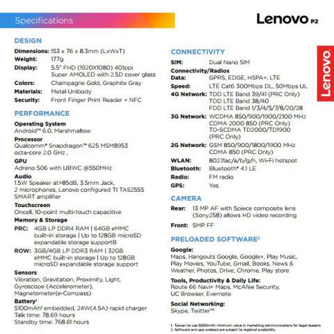 8 ноября компания Lenovo представит долгожданные новинки: Moto M и Moto M Plus. Кроме того, в Китае анонсируют специальную версию уже знакомого нам смартфона Lenovo P2. Столь близкий контакт устройств привёл к определённой путанице в СМИ, и, как следствие, среди некоторых читателей, которые поверили, что в Moto M будет установлен процессор Qualcomm Snapdragon 625 и батарея на 5 100 мАч. Как оказалось, всё это относится к китайскому Lenovo P2, полный перечень характеристик которого сегодня утром оказался в сети.