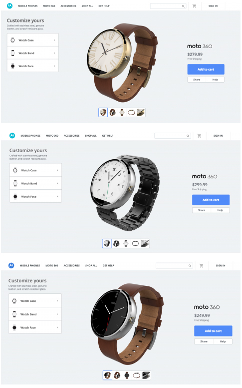 Как и было обещано ранее, в фирменном сервисе Moto Maker компании Motorola появилась возможность настройки внешнего вида "умных" часов Moto 360 перед покупкой. К сожалению, возможностей для кастомизации часов не так много, как хотелось бы. Пользователю доступно на выбор три цвета корпуса: серебристый, тёмно-серый и золотистый, который прибавит $30 к стоимости часов. Также вы можете выбрать ремешок: 22-мм кожаный, доступный в трёх цветах, 24-мм с металлическими звеньями (+$50 к стоимости), 23-мм или 18-мм металлический в тех же цветах, что и корпус, за дополнительные $50. Помимо этого, компания предлагает на выбор 11 цифровых циферблатов, один из которых может быть бесплатно предустановлен перед отправкой.