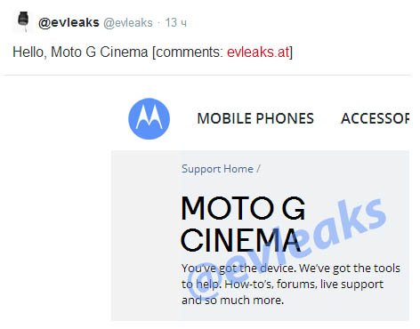 За последнее время на официальном сайте компании Motorola несколько раз появлялось упоминание о смартфоне Moto X+1, который должен стать преемником прошлогоднего Moto X и новым флагманом компании. Сегодня на сайте компании появилось упоминание об ещё одном неанонсированном смартфоне - Moto G Cinema. Пока никакой информации о новинке нет, однако есть предположение, что данный аппарат станет сиквелом прошлогоднего бюджетного Moto G и получит дисплей большего размера и фронтальные стереодинамики. Помимо этого, Moto G Cinema будет оснащен более мощными техническими характеристиками.