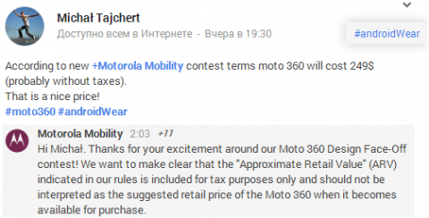 Компания Motorola объявила о начале конкурса для пользователей на лучший дизайн "умных" часов Moto 360, где в качестве приза выступает само устройство. В правилах конкурса также упоминается стоимость разрабатываемых моделей - $249. Вчера в Google+ компания официально заявила, что указанная цена является лишь одним из критериев конкурса и не должна восприниматься как розничная цена на изделие.