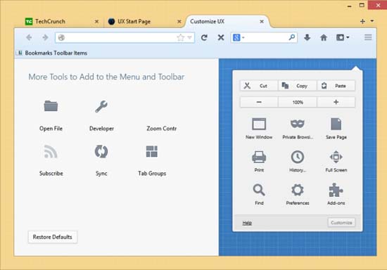 Интересно, что проект Australis занят не только новым дизайном. Mozilla также планирует поменять схему пользовательской настройки браузера. Планируется выпуск инструментария, который позволит обустраивать пространство обозревателя так, как это удобно пользователю: перемещать и изменять порядок практически каждого элемента в интерфейсе Firefox.