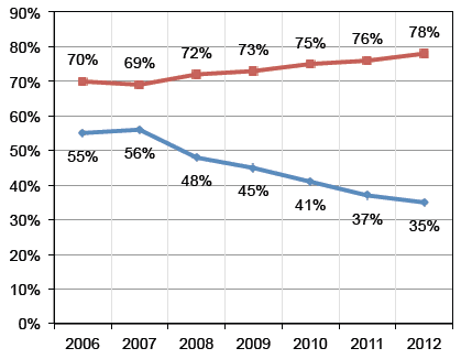 Что характерно, подобный опрос проводят уже семь лет подряд, и в последние годы явно наметилась проблема с приватностью пользователей. Простые американцы всё реже говорят, что контролируют свою приватную информацию (синий график), и всё чаще признают важность конфиденциального хранения этой информации (красный график).