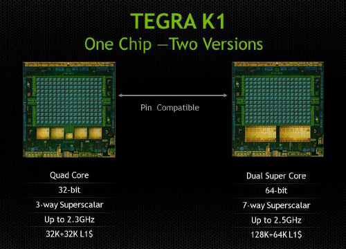В настоящее время NVIDIA предлагает систему на чипе Tegra K1 с графическим процессором GeForce на базе архитектуры Kepler, а также четырьмя ядрами ARM Cortex-A15 или двумя ядрами NVIDIA Denver общего назначения. Компания, как ожидается, представит новое поколение Tegra с графикой Maxwell в 2015 году.