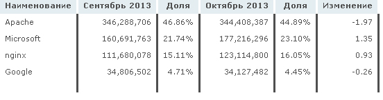 Самый значительный прирост базы показал сервер Microsoft IIS, который увеличил базу на 16,5 млн хостов. С мая этого года IIS шел ноздря в ноздрю с nginx, однако сейчас IIS увеличил отрыв и теперь оторвался от него на 5%. Отметим, что с 18 октября корпорация Microsoft разместит для ИТ-специалистов и администраторов новую версию IIS 8.5 и здесь вероятен дальнейший отрыв от nginx.