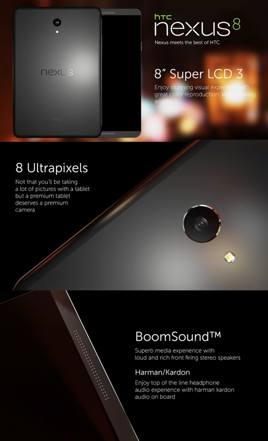 Учитывая, что по слухам его производством может заниматься компания HTC, дизайнеры нарисовали концепт новинки, заодно добавив свои ожидания от характеристик. В итоге получился металлический стиляга с топовой начинкой, превосходящей флагманы HTC. Восьмидюймовый экран и 64-битный процессор от NVIDIA, экран Super LCD 3, камера с разрешением 8 ультрапикселей, динамики BoomSound и программное улучшение звука Harman/Kardon.
