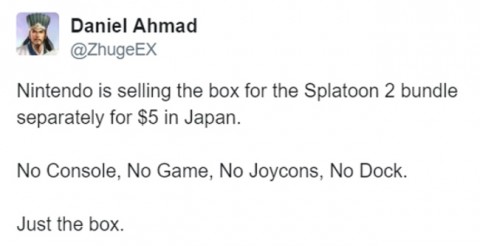 Одним из первых забавную находку обнаружил известный аналитик из Niko Partners Даниэль Ахмад. Он подтвердил, что это не розыгрыш и Nintendo действительно продаёт пустую коробку от бандла за $5. Страница описания товара гласит, что данная коробка может пригодиться фанатам Splatoon, у которых уже есть Nintendo Switch. То есть в некотором роде это коллекционная вещь. Действительно ли Nintendo подумала о коллекционерах, или на производстве просто наштамповали больше коробок, чем требовалось, - об этом мы, пожалуй, никогда не узнаем.