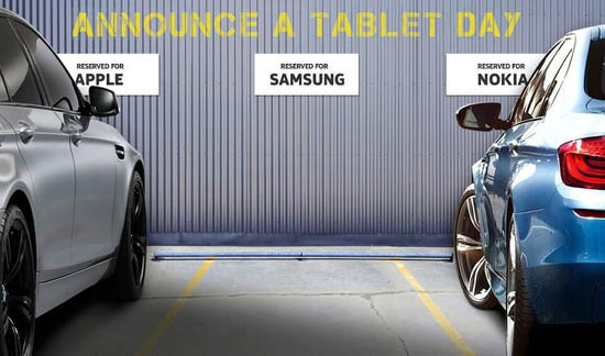 Себя и Apple в Nokia сравнили с дорогими BMW M5, для которых на парковке (то есть на рынке планшетов) зарезервированы широкие, просторные места. Для Samsung же отвели совсем маленький участок, что, вероятно, должно символизировать небольшую долю корейских планшетов.