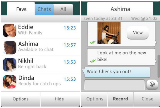 WhatsApp обрел широкое распространение из-за собственной кросс-платформенности. Специально оптимизированная версия службы для Asha 501 позволяет, как и на смартфонах, не только отправлять и принимать сообщения, но и тоже самое делать с фотографиями, видеофайлами и голосовыми посланиями. Уведомления WhatsApp демонстрируются на Fastlane, втором домашнем экране на Asha-платформе.