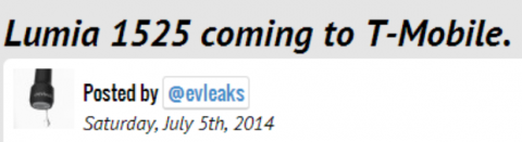 Впервые информация о том, что линейка устройств Nokia Lumia пополнится моделью Lumia 1525, появилась в январе этого года. Известно, что новинка станет сиквелом популярного смартпэда Lumia 1520, впервые анонсированного осенью прошлого года. Сегодня известный инсайдер @evleaks опубликовал сообщение, которое гласит, что Nokia Lumia 1525 станет операторской версией T-Mobile.