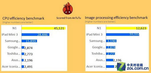 Секрет столь высокой производительности Nokia N1 заключается в использовании 64-битного процессора Intel Atom Z3580 с тактовой частотой 2,3 ГГц и графическим чипом PowerVR G6430, который обычно ставят в нетбуки. В iPad mini 3 используется ARM-процессор предыдущего поколения Apple A7.