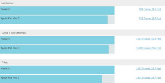 Nokia N1 продемонстрировал превосходство над iPad mini 3 в тестах AnTuTu и GFXBench. Первый оценивает вычислительные возможности процессора, второй – графической подсистемы. Финскому планшету в AnTuTu удалось набрать 45 121 очков, в то время, как iPad mini 3 показал результат в 28 446 баллов. В GFXBench планшет Nokia также оказался на первом месте, правда со значительно меньшим отрывом.
