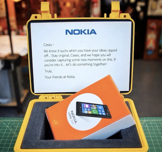 Nokia не оставила без внимания инцидент, который случился между американской корпорацией Apple и известным клипмейкером Кейси Нейстэтом (Casey Neistat). Дело в том, что Кейси снял рекламный видеоролик об очередях за новыми iPhone 5S и 5С, который Apple в последствие перемонтировала и, удалив все указания на автора, выдала видеоклип как свой собственный. Узнав об этом, финны направили Кейси Нейстэту «утешительный презент» в виде новенького смартфона Nokia Lumia 1020. К подарку прилагалась записка: «Кейси, мы знаем как паршиво бывает когда крадут твои идеи и мы надеемся, что ты решишь запечатлеть новые мгновения с помощью этого. Давай сделаем что-то вместе! Твои друзья из Nokia». Ирония компании очевидна. Реакция самого Кейси Нейстэта пока неизвестна.
