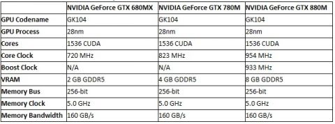 Также снова появились спецификации новой линейки мобильных видеокарт от Nvidia, подтверждающие ранее уже публиковавшуюся информацию. Как и в случае с новыми мобильными Radeon, речь идёт о ребрендах чипов прошлого поколения. Линейка GPU GeForce 800M снова будет основана на архитектуре Kepler.